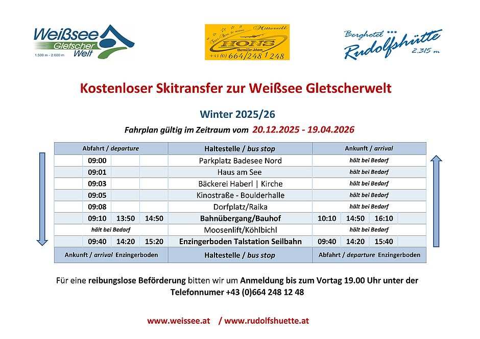Gönnen Sie auch Ihrem Auto Ferien und nutzen Sie unseren GRATIS Ski-Transfer von Uttendorf zur Talstation Enzingerboden